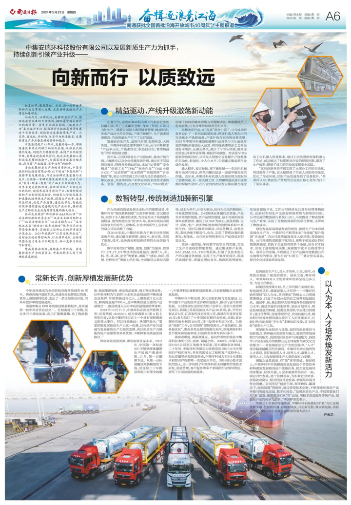 2023年10月11日,中集環(huán)科在深交所掛牌上市(證券代碼:301559),成為南通第50家A股上市的企業(yè),這是中集環(huán)科歷史上一個(gè)具有里程碑意義的重大事件。何以行穩(wěn)致遠(yuǎn)?季國(guó)祥表示:“緊緊把握發(fā)展新質(zhì)生產(chǎn)力這一機(jī)遇,以傳統(tǒng)產(chǎn)業(yè)為基礎(chǔ)為發(fā)展新質(zhì)生產(chǎn)力提供支撐,再以新質(zhì)生產(chǎn)力賦能傳統(tǒng)產(chǎn)業(yè)重塑競(jìng)爭(zhēng)新優(yōu)勢(shì),不斷探索高質(zhì)量發(fā)展路徑?!?spanyes';font-family:微軟雅黑;font-style:normal; font-size:12.0000pt;mso-font-kerning:0.0000pt;"="">