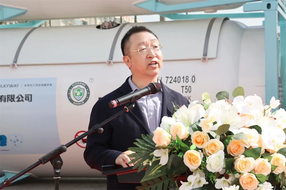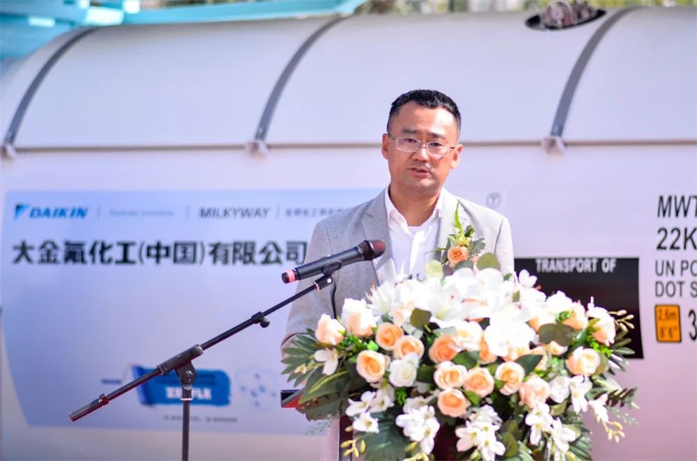 上午10點58分,下線儀式準時開始,中集環(huán)科季國祥總經理代表制造商致辭,他表示,密爾克衛(wèi)、大金氟化工、中集環(huán)科分別作為化工倉儲物流、精細化工、能源化工物流裝備領域的佼佼者,不忘各自肩負的使命和責任,敬畏環(huán)境,敬畏生命,在綠色發(fā)展、低碳發(fā)展、可持續(xù)發(fā)展方面取得了令人驕傲的成績,作出了敢想敢為的表率。本次下線的氣體箱產品采用了創(chuàng)新的新材料、新工藝,在筒體和框架采用了大金氟化工新一代4F型高固體分、低VOC環(huán)保氟碳樹脂油漆,具有超長耐候、優(yōu)良的防腐性能;同時,罐內也率先采用了氟盾水性漆,與傳統(tǒng)的鍍鋅工藝相比,不僅兼容性能更好,而且更加綠色環(huán)保,也便于日后維護。這些新技術的應用淋漓盡致地體現了三家企業(yè)在追求綠色發(fā)展、低碳發(fā)展上相同的理念和作出的努力,中集環(huán)科非常榮幸未來繼續(xù)與密爾克衛(wèi)、大金氟化工一起成長,成為全球化工物流綠色發(fā)展、高質量發(fā)展的倡導者和創(chuàng)新者。