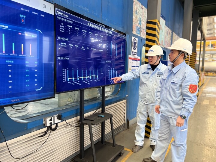 中集環(huán)科標(biāo)罐車間內(nèi),生產(chǎn)執(zhí)行系統(tǒng)(MES)的使用,讓管理者更加精準(zhǔn)把控生產(chǎn)進(jìn)度節(jié)點(diǎn);去年投入運(yùn)營(yíng)的噴粉車間,較以往用工減少了60%以上、生產(chǎn)效率提高了40%以上,工作人員通過(guò)中控室的數(shù)字大屏,可隨時(shí)了解車間生產(chǎn)運(yùn)營(yíng)、產(chǎn)量進(jìn)度以及能耗管控等情況……